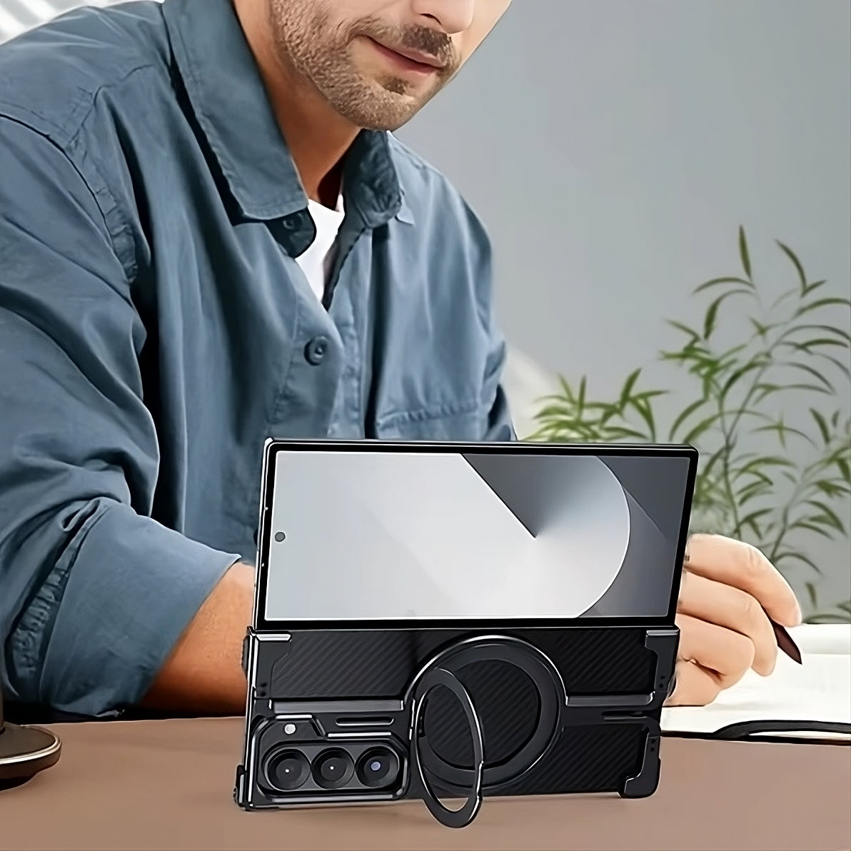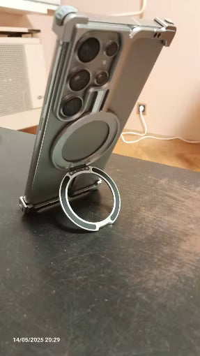 Its mechanical frameless structure delivers a bold, industrial-inspired look that appeals to those who appreciate both minimalist design and premium craftsmanship. The integrated 360° rotating metal ring adds dual functionality—working as a secure grip for daily use and as a stand for effortless hands-free viewing.